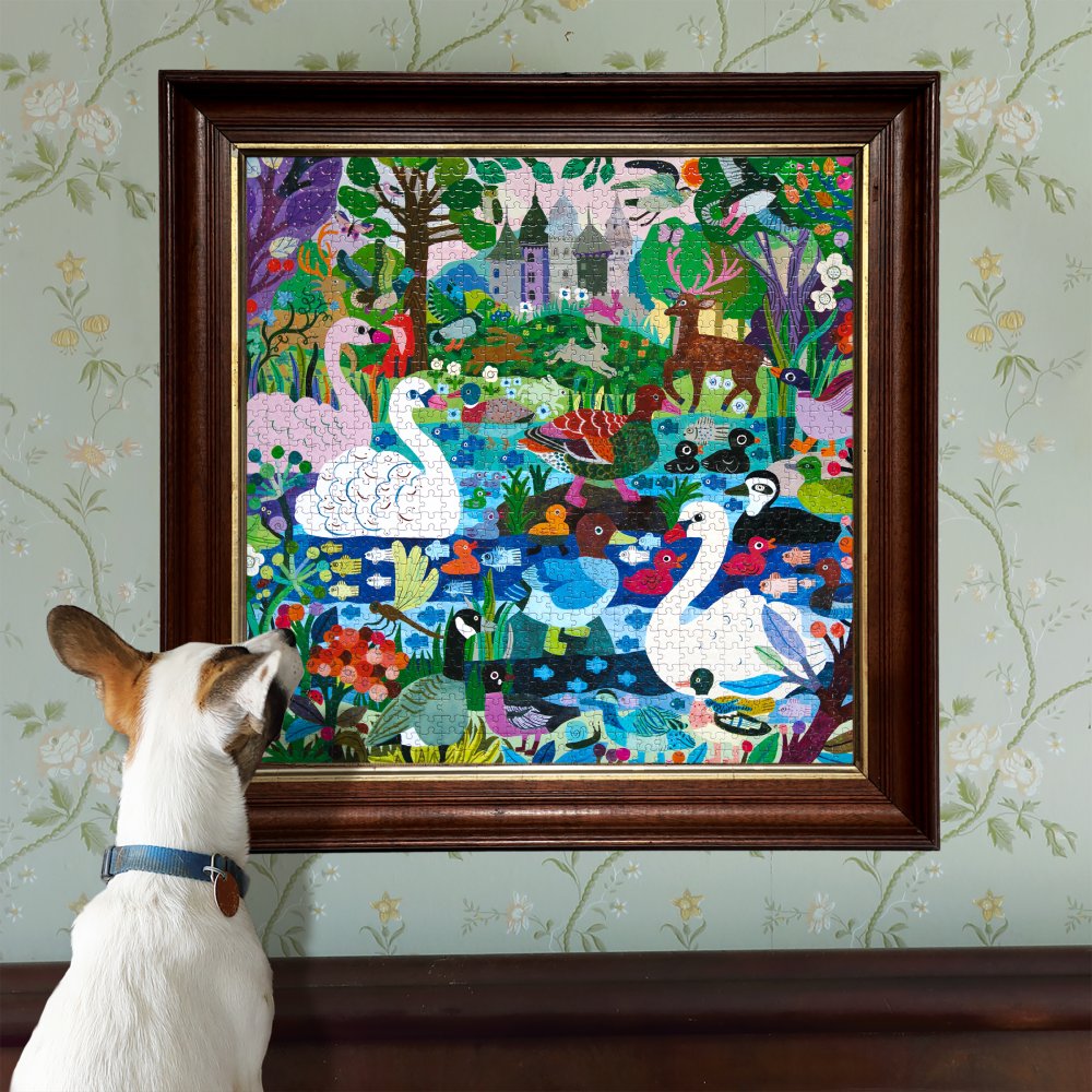 Evoke the calm magic of rural Britain encapsulated in the moment we come upon thee ducks, swans and other creatures within a dreamlike glen in this captivating artwork by Monika Forsberg.